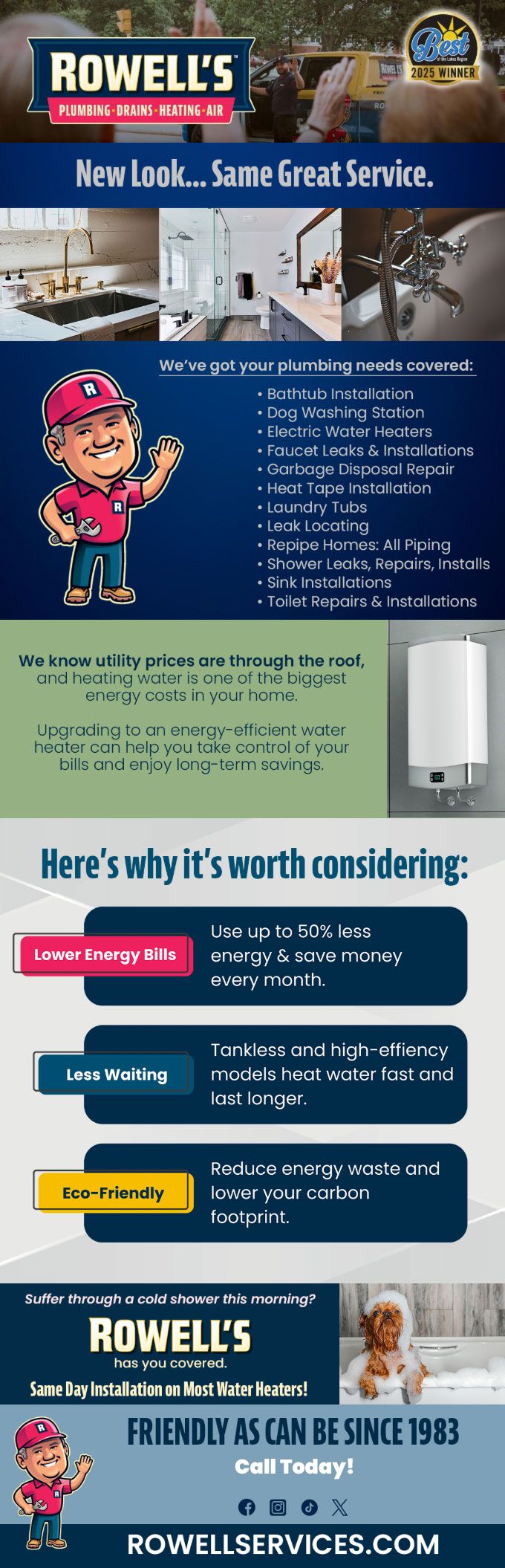 "Friendly As Can Be Since 1983!" When you need help with your plumbing, drains, heating, cooling or electrical in Woodstock, you can always rely on Rowell's Services! Call us now or book online!